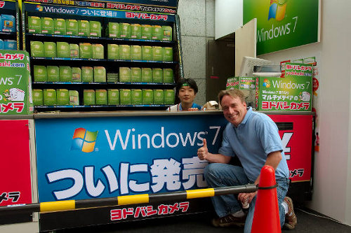 Microsoft tried to torpedo the success of the Japan Linux Symposium by launching their Windows 7 product that same day. They even had setup a big promotion booth across the street from the conference center.During a break, we decided to make some fun of Microsoft and dragged Linus over there. When we arrived there, Linus was sold immediately on the product as you can see in the picture. At least that's what the sales guy thought. He obviously had no idea who he was dealing with. But in the end Linus surprisingly did not buy a copy. Wise man!