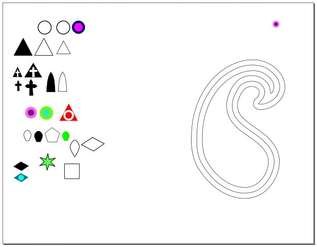 In the example below, the pink & purple circles and the outside purple circle combination were added to the outermost curve, the blue & purple ellipses were added to the next curve inside, then the diamonds were added to the innermost curve.