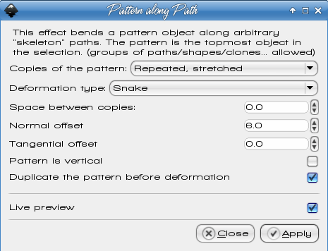 Single; Repeated; Single, stretched or Repeated, stretched - This choice determines how the objects are arranged around your path. Single means that only a single copy is used, while repeated means that (obviously) the pattern is repeated all around the path. Stretched means that the pattern is stretched around whatever curve you use.