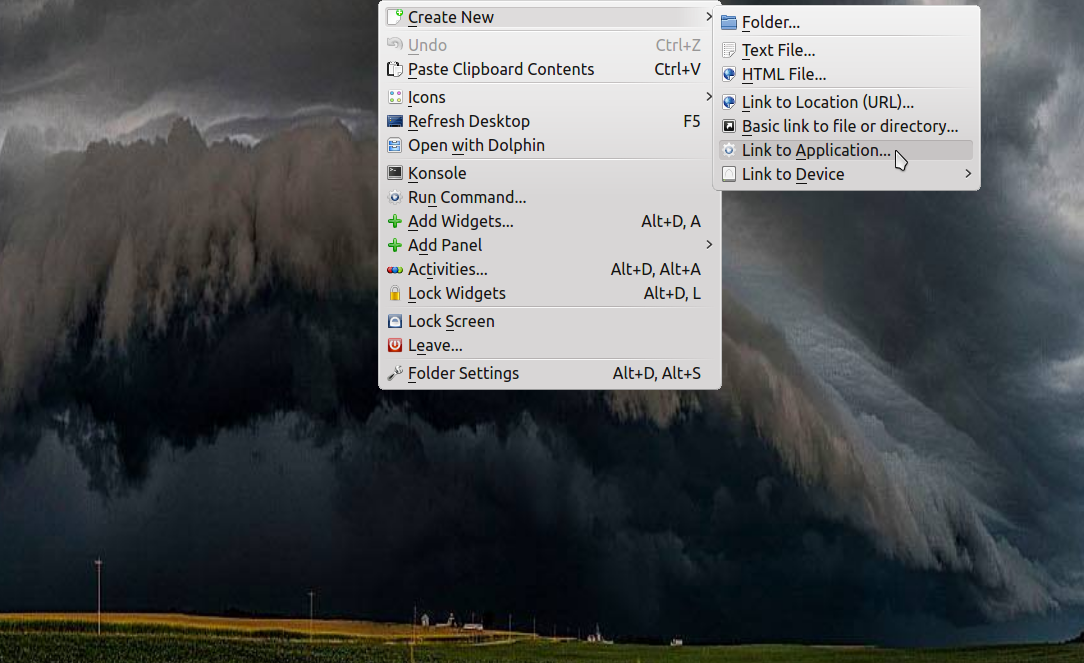 We are now instructed to install the latest Google Chrome browser package. I have this installed already so no need to go back into Synaptic for me. If you do not have it installed, do so now. The next step is to create an application launcher icon on the desktop. Easy enough (I hope I'm not going to regret saying that). I will right click on the desktop and select: Create New > Link to Application.