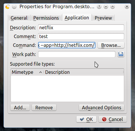 This will bring up the application link configuration window. Select the application tab. Add the name and a note. The post reply says to type the command "google-chrome --no-default-browser-check --user-data-dir=/$HOME/.config/netflix --app=http://netflix.com/" into the "Properties" box, but I do not see a "Properties" option in the window.