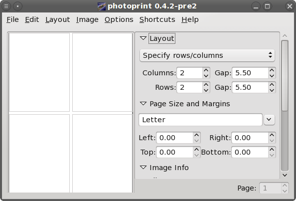 To print several photos at once, you can first choose the layout method. There are two methods that you can use: specify rows/columns or specify image dimensions. Example: when you want to fill the paper with 4 photos, you can set the parameter as follow (units are in millimeters):