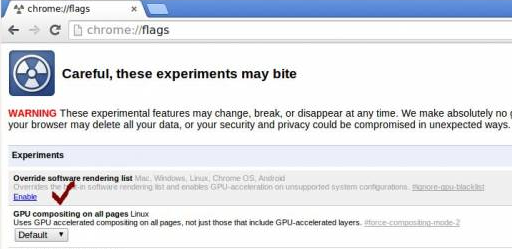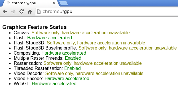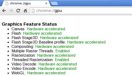 Now, in Experiments, click Override software rendering list, click Enable, and restart the browser for the changes to take effect. Now, in the browser, type chrome://gpu. The result should be this: