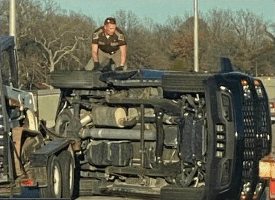 A trooper for the Oklahoma Highway Patrol was driving the Turner Turnpike when he noticed the vehicles slowing, and discovered that a semi had jackknifed and overturned. He ran up to the truck and found that the occupants were still inside. He had to climb up on the trailer and make his way to the truck. Luckily, the door still worked and he was able to get the two people out of the truck.